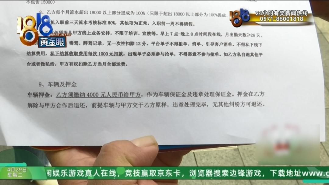 杜女士:这种虚假的引导之后,给我们做了这样的一个承诺,还有底薪的保证,我们就交了4000块钱的违章保证金。交了4000块钱以后,我们来签合同的时候呢,他说又要交1250元,车队费和平台注册费。