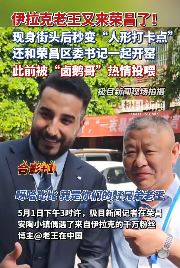 “老王!老王!”5月1日下午3时许,极目新闻记者在荣昌安陶小镇偶遇了来自伊拉克的千万粉丝博主@老王在中国。街上,多名游客都认识他,热情招呼他拍照合影,他也十分热情配合。当地街道办书记也上前热情合影,两人对镜头竖起大拇指。