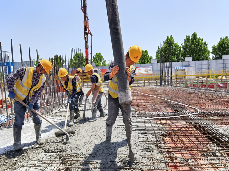 建设者正在浇筑混凝土(央广网记者 张琳琳 摄)