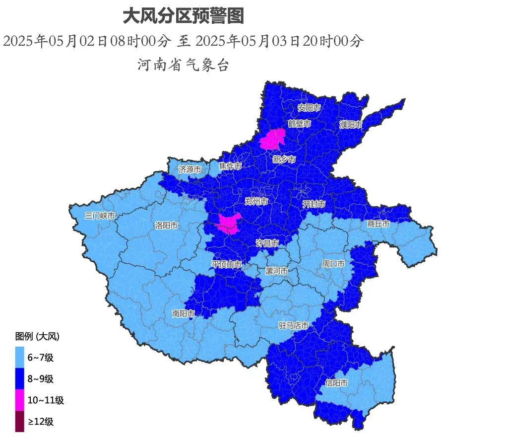河南省气象台2025年5月1日17时00分继续发布大风蓝色预警:受冷空气影响,预计2日8时至3日20时,全省大部偏南风或西南风转偏北风4到5级,阵风6到7级,其中黄河以北和洛阳北部、郑州、开封、商丘北部、平顶山、许昌、南阳北部、驻马店东部、周口东部、信阳部分县(市、区)阵风8到9级,局部可达10到11级,并伴有扬沙或浮尘。