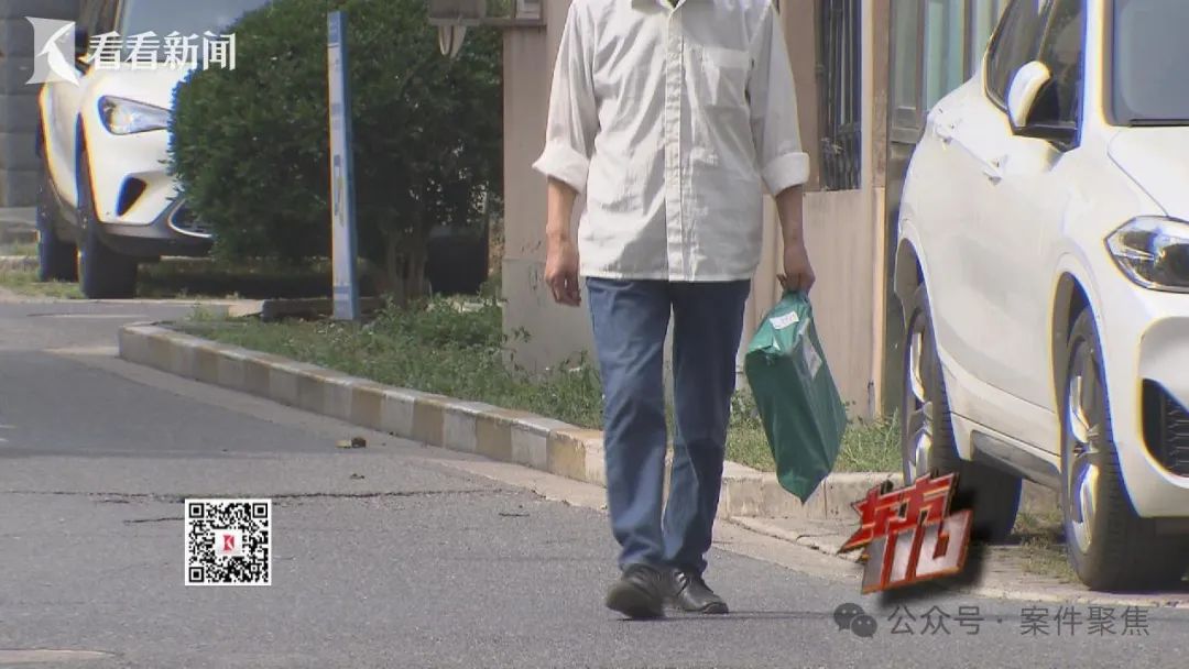 十几分钟后,张某从楼栋里出来。注意看,张某出来时驼背、双手抱胸,像是衣服里装了什么东西一样。