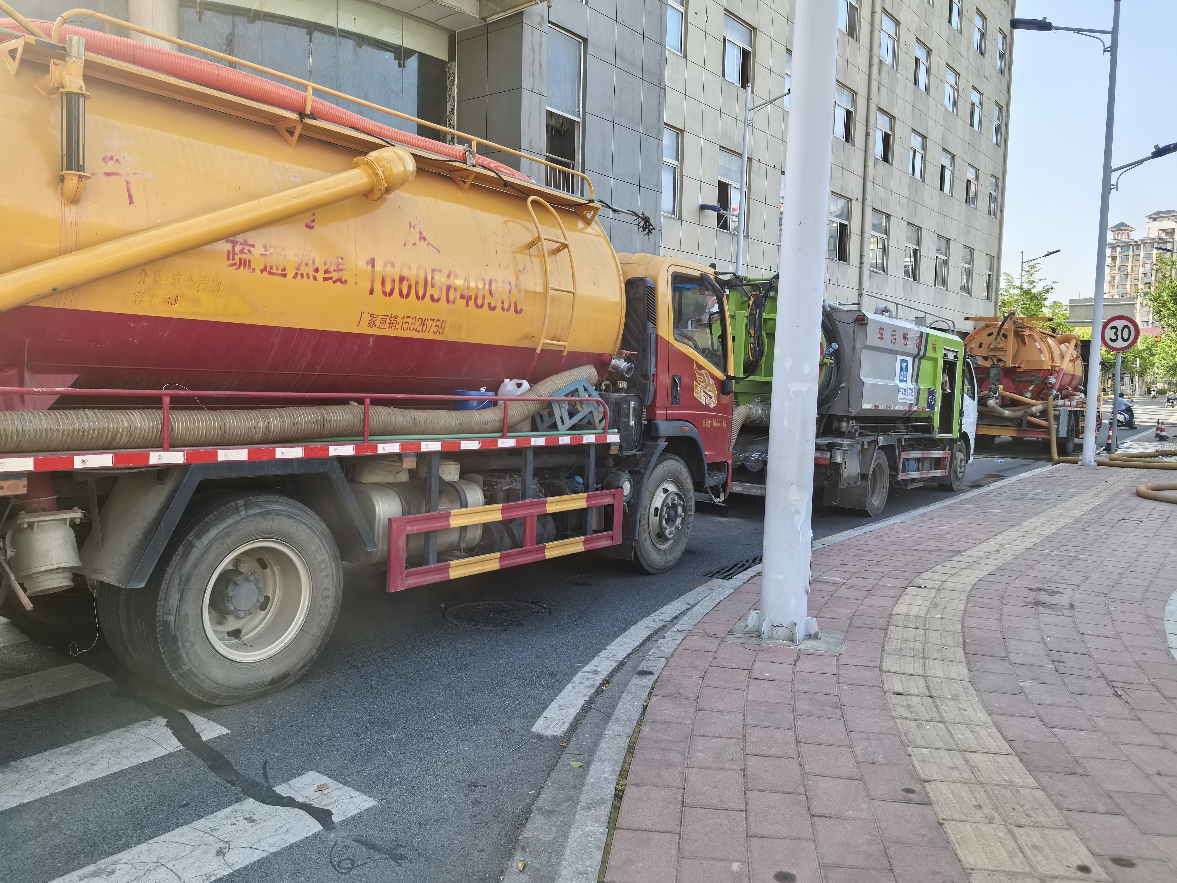 大皖新闻记者看到,在岸上道路边有多辆施工车辆在排队,其中来来回回的是高压清洗车,这种车带着一根长长的软管,一头深入河道,由水泵抽取冲洗后的泥浆,注入车罐中,然后拉到指定地方处理。