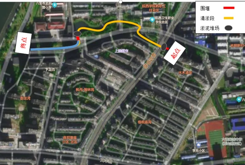 该公告说,本次清淤段起点为大雁河解放路桥,终点至大雁河排涝站前端河道,清淤长度约600米(详见下图)。