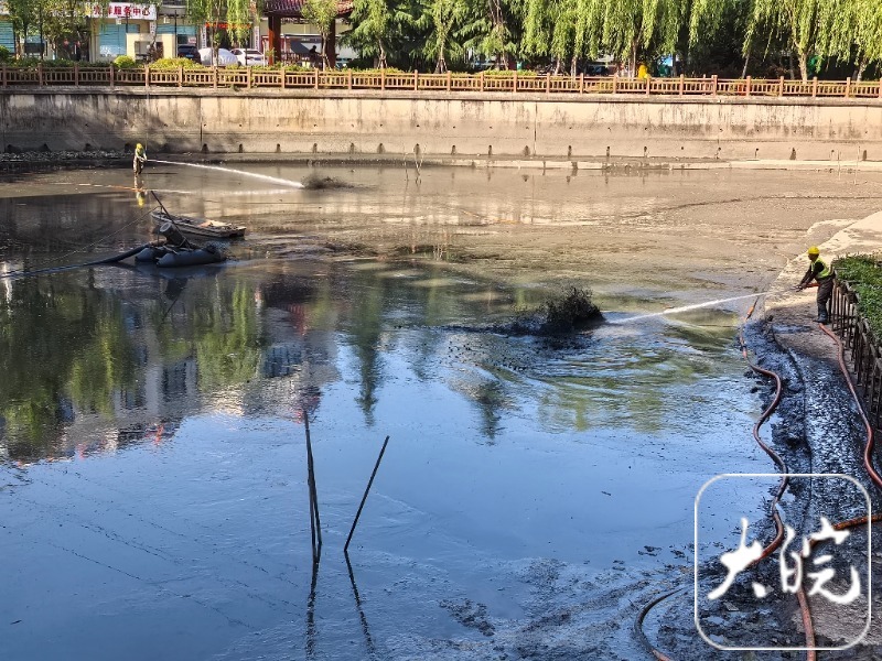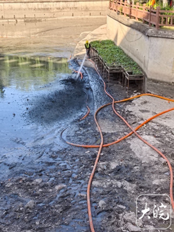 大皖新闻记者5月1日下午来到正在进行清淤作业的施工现场看到,河道水位已经落到最低,两名工人站在河道边缘,各自紧握高压水枪,对着河道里的淤泥进行冲刷,激起黑色的泥浆。岸上则有多名身穿"河道运维"字样工服的工人在忙碌。