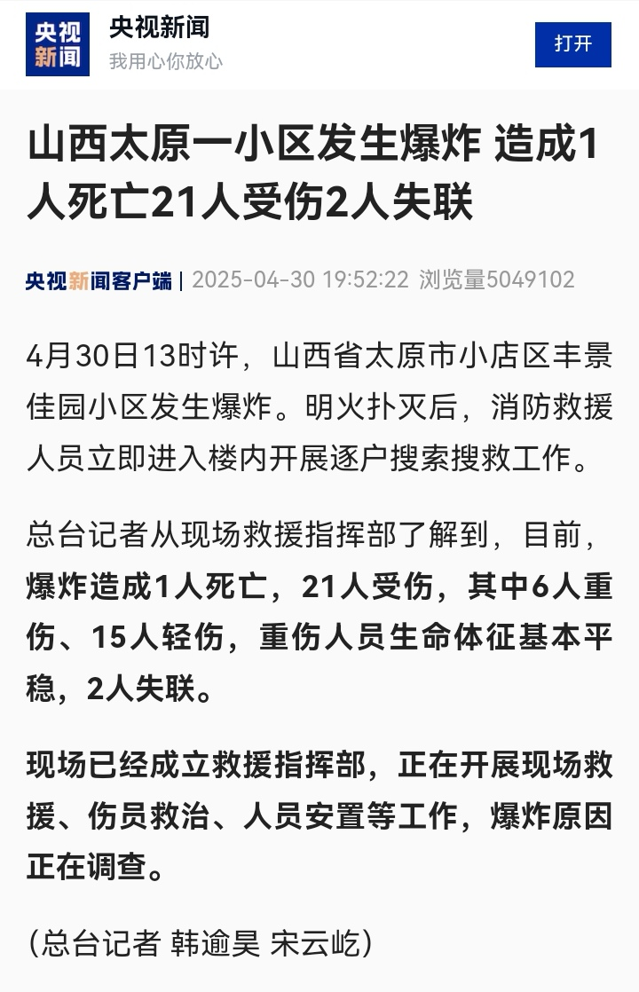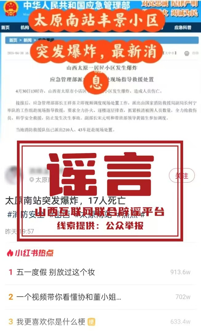 4月30日,网上出现“太原南站突发爆炸,17人死亡”的消息,经调查核实,以上为不实信息。央视新闻已发布相关信息,望广大网民对谣言不听、不信、不传。