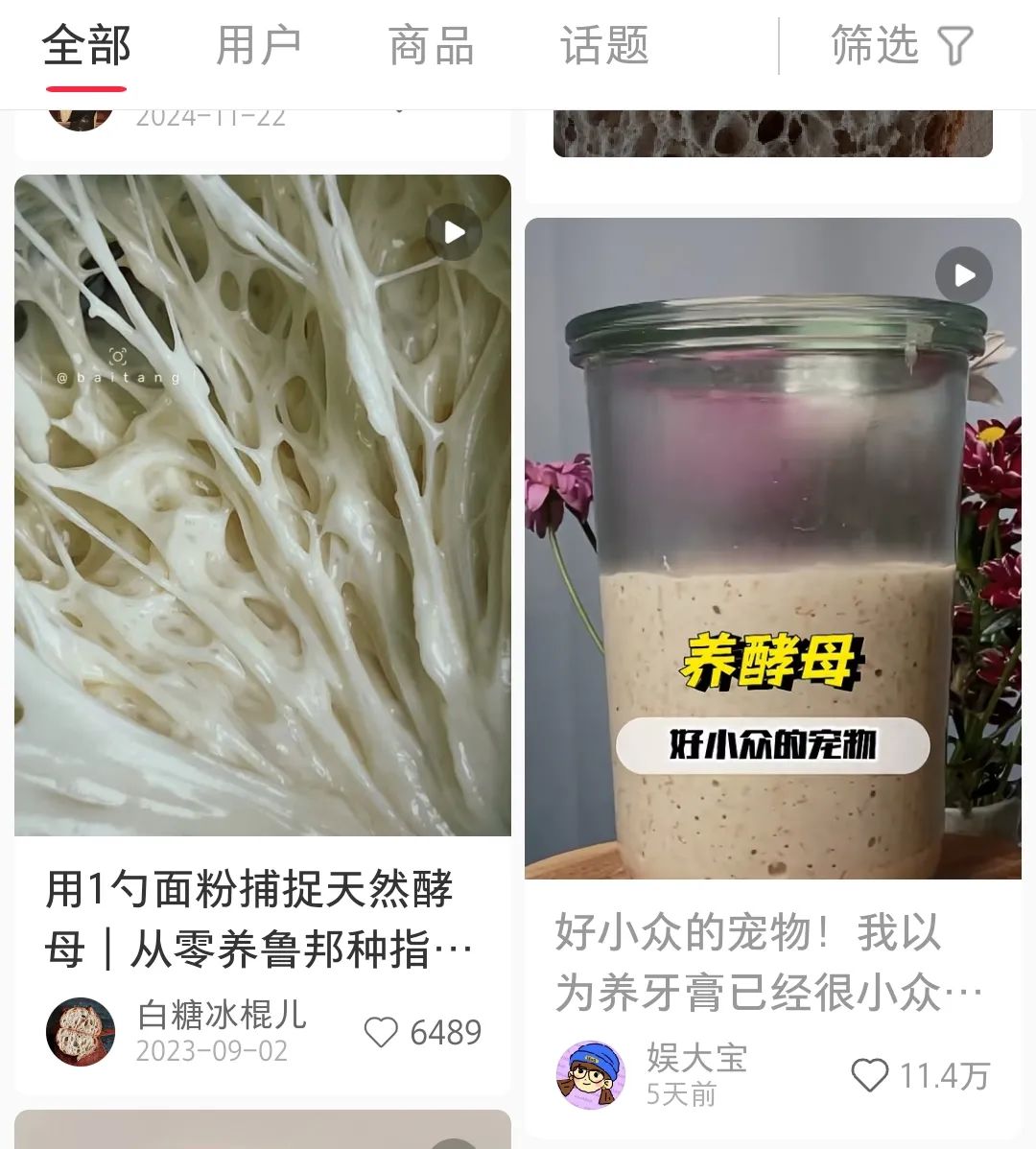 在社交媒体平台搜索发现,分享养酵母攻略的帖子多达上万条,不少网友晒出了自己养的酵母品类,鲁邦种、水果天然酵母、啤酒花酵种……他们还会给酵母起名字,甚至会记录它们的“成长日记”。