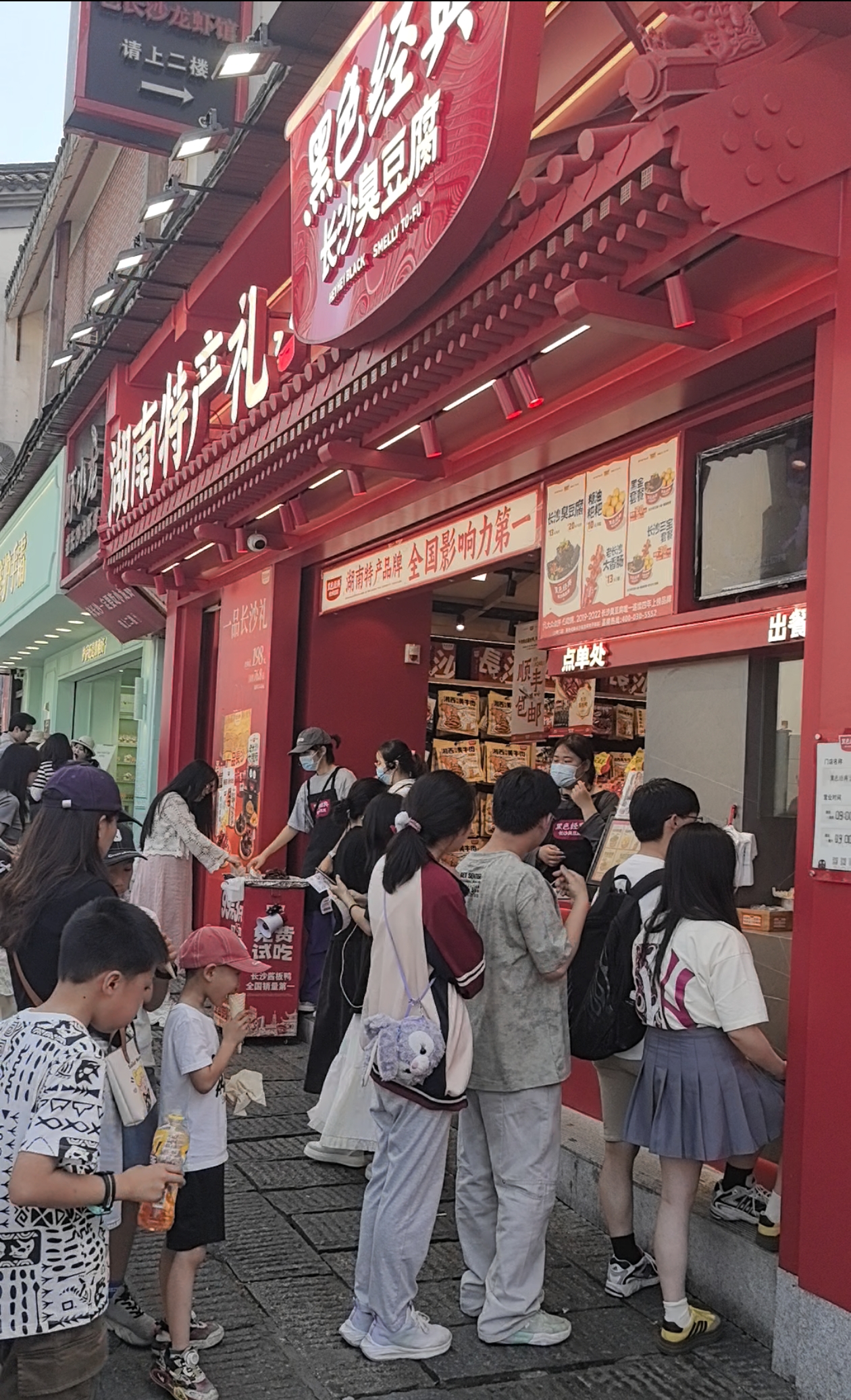 太平老街上人头攒动,不少游客在黑色经典臭豆腐店门口排队,等拿到了臭豆腐后又继续去奶茶店排队。