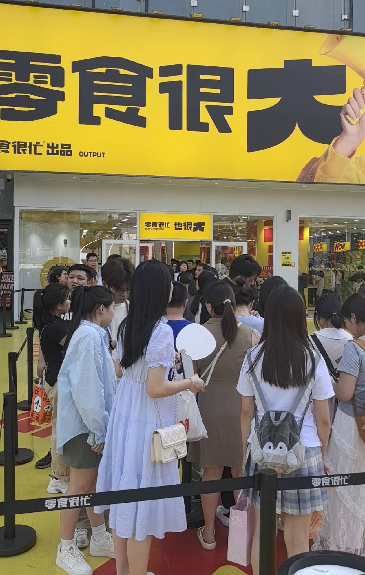 每一家茶颜悦色奶茶店门口都排起了队,“零食很大”门口还设置了排队用的栏杆,游客需要排队分批进入店内选购。