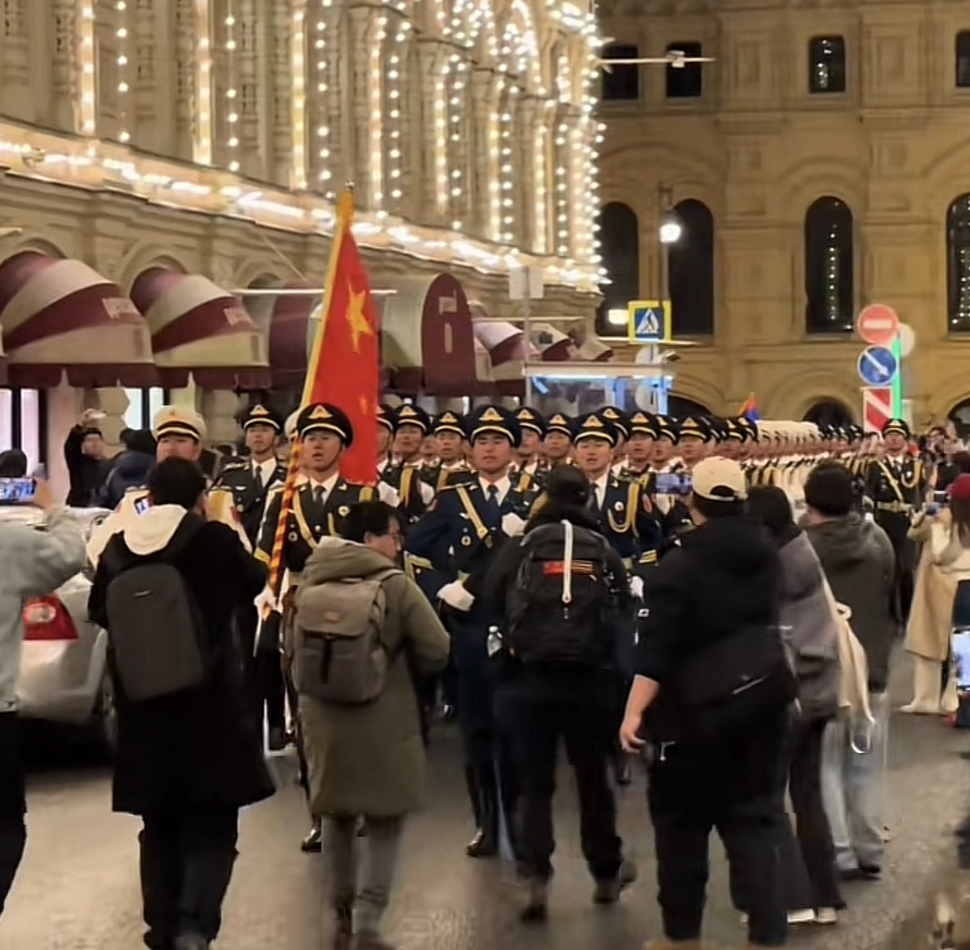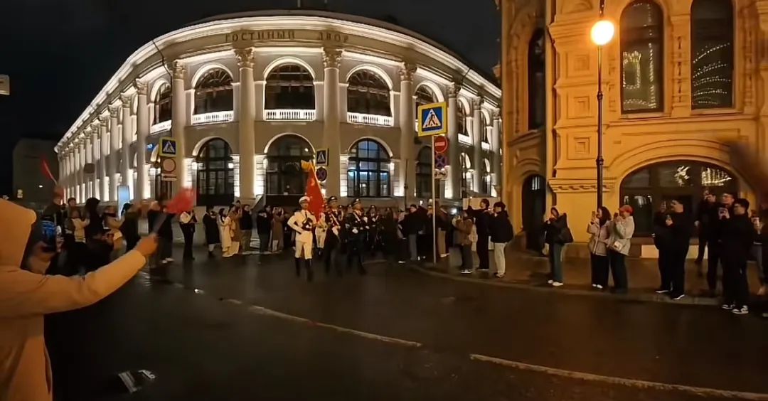 5月1日,在俄罗斯留学的王先生告诉潇湘晨报记者,当地的留学生们在红场外的街道上等待彩排完后的三军仪仗队,当晚10点半左右,“当三军仪仗队迎面走来的时候,那种军人的威严、大国的气势也迎面袭来”。那一刻王先生的内心充满了自豪感,他和同胞同学们跟上方队,情不自禁地唱起了军歌。
