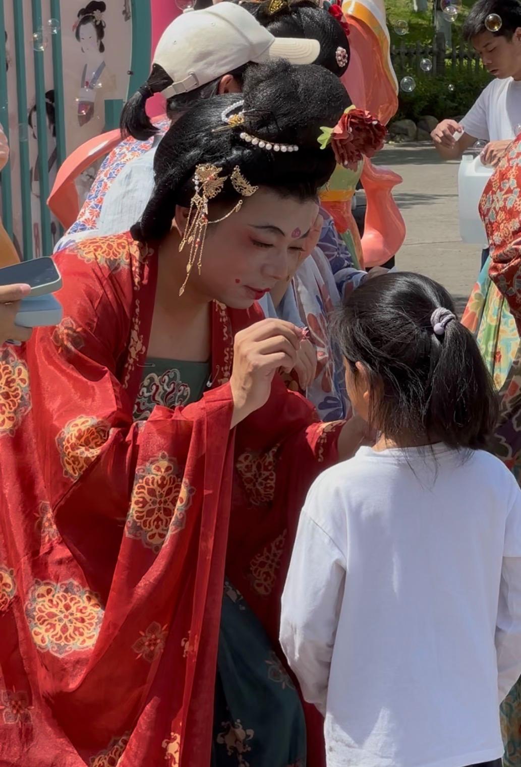 开场舞过后,“唐俑姊妹花”们会摆出各种动作,邀请游客进行拍照,并给游客们粘贴花钿。