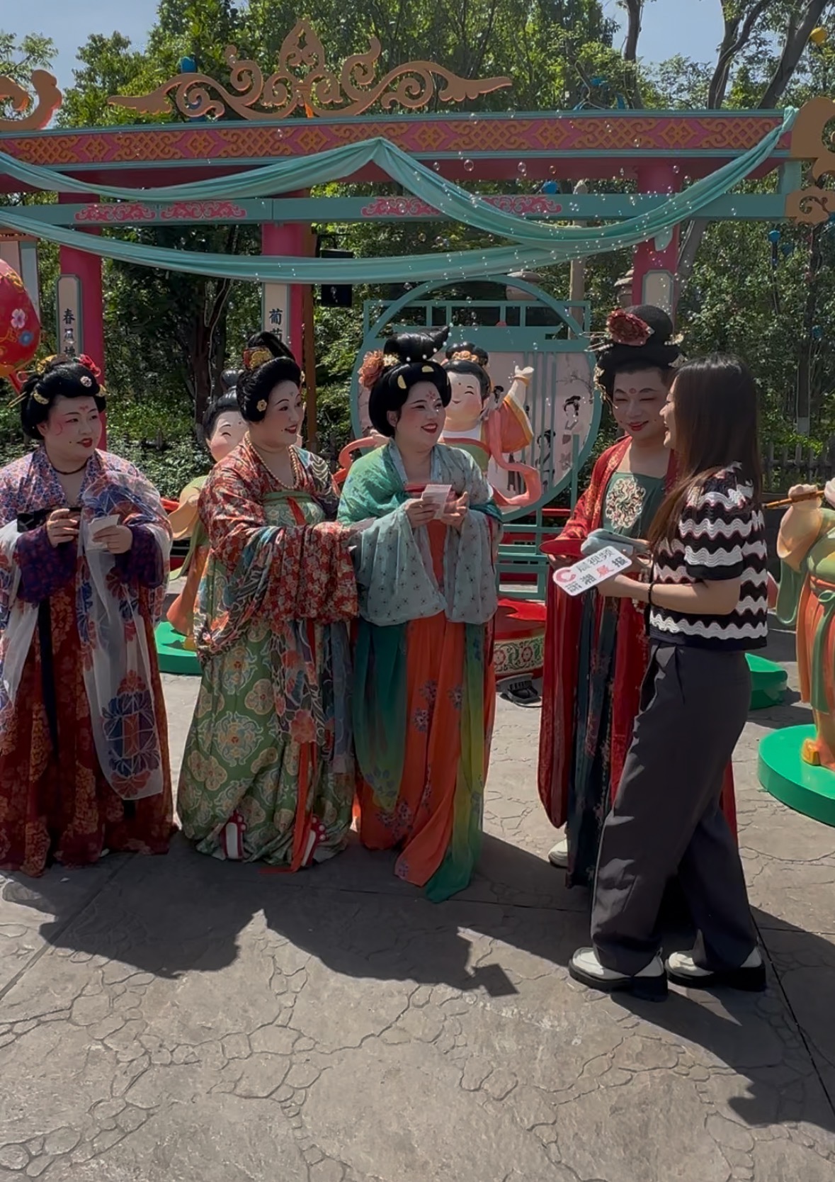 化妆、换服装、学动作、与游客互动,记者全流程体验下来,已经有些疲惫,而在一旁的NPC“姐妹”们依旧热情不减,直到把最后一波游客送出园。