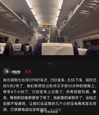 有东北网友发文称,他在5月1日晚乘坐D7987次列车(始发站哈尔滨,终点站七台河西)出行,19时50分左右上车,按计划应该是20时30分左右到站。然而,列车在出牡丹江站不到10分钟的时间,突然停车。且停车已经超过4个小时,网友称其发文时时已经到5月2日凌晨,动车依然没有开动。该网友称,列车员告知旅客停车原因是前方有列车发生故障。