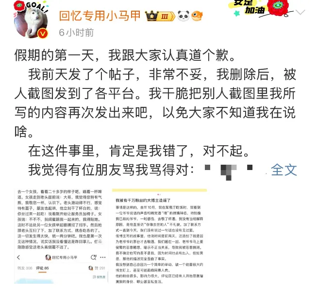 错在我,本来也不该嚼人家舌根。我这两天一直在反思自己,大家批评的对,我确实太久没被骂,飘了。