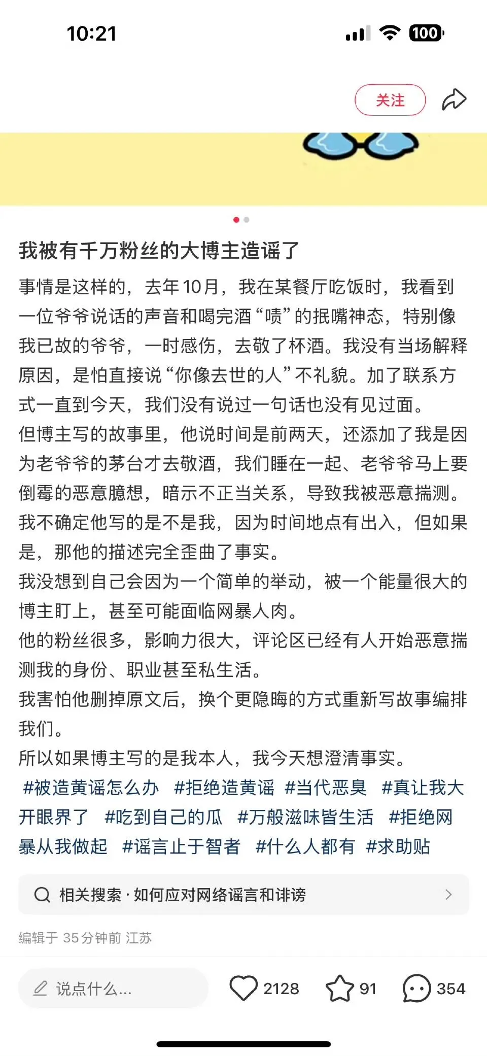 有网友发文称自己“被有千万粉丝的大博主造谣了”。该网友说,自己在餐厅吃饭时,看到一位老人说话的声音和喝酒的神态像自己已故的爷爷,才去敬了酒。不确定@回忆专用小马甲 写的是不是自己,因为时间、地点有出入,但如果是,那相关描述完全是歪曲事实。