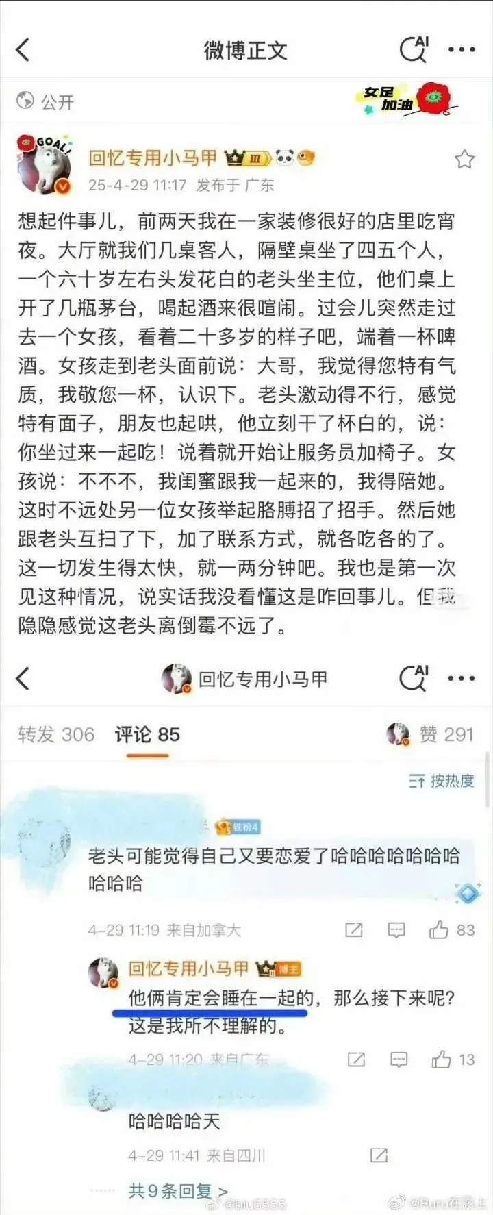 4月29日,@回忆专用小马甲 发文称,在餐厅目睹一名年轻女孩向花甲老人敬酒并互加联系方式,暗示两人存在不正当关系。之后该帖虽然被删除,但截图在多个平台传播。