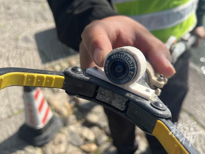 他介绍,目前运用的是第三代打捞杆——伸缩可视化打捞杆,一端装有机械握柄、可视化屏幕,一端配备有高清摄像头和大钳子。“杆子拉长后有5米,在没有淤泥的情况下,通过手持端的屏幕能看到湖底情况,钳子可以90度旋转,手机、耳机、相机、眼镜等都能夹得住。”