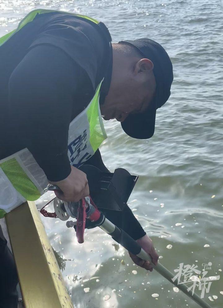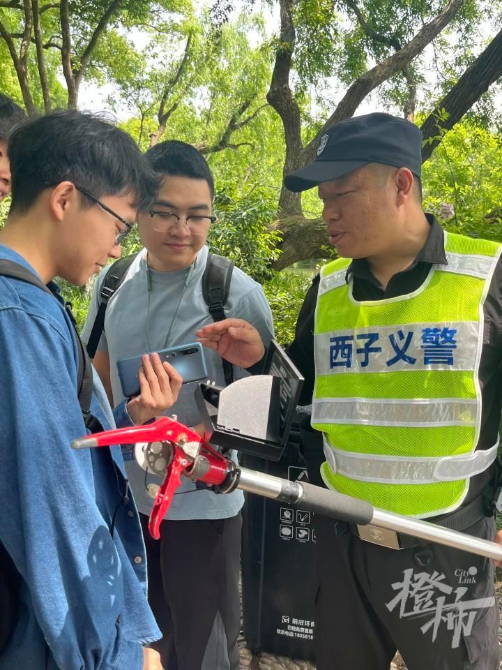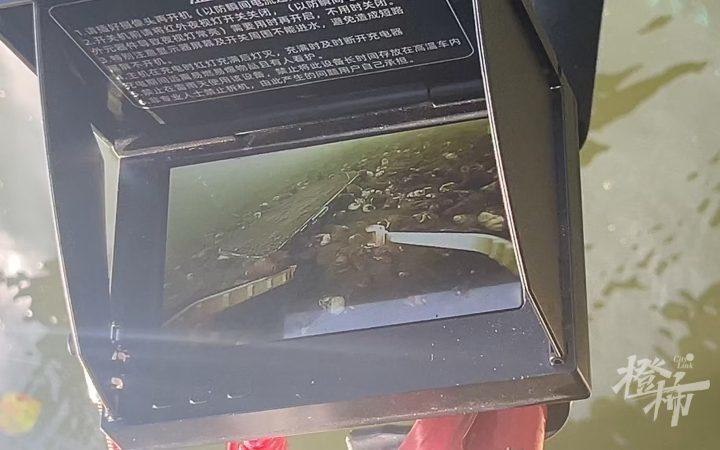 11:05,岛内又传来东北角有游客手机掉入湖中的求助信息。但这次前去的是一位身披“西子义警”马甲的大哥。我跟着他前去现场,他把打捞杆伸向湖中,我凑近看,手持端的屏幕上能清晰看到水下的情况。