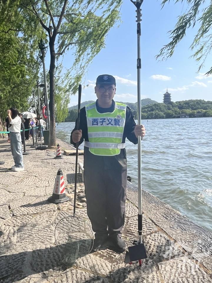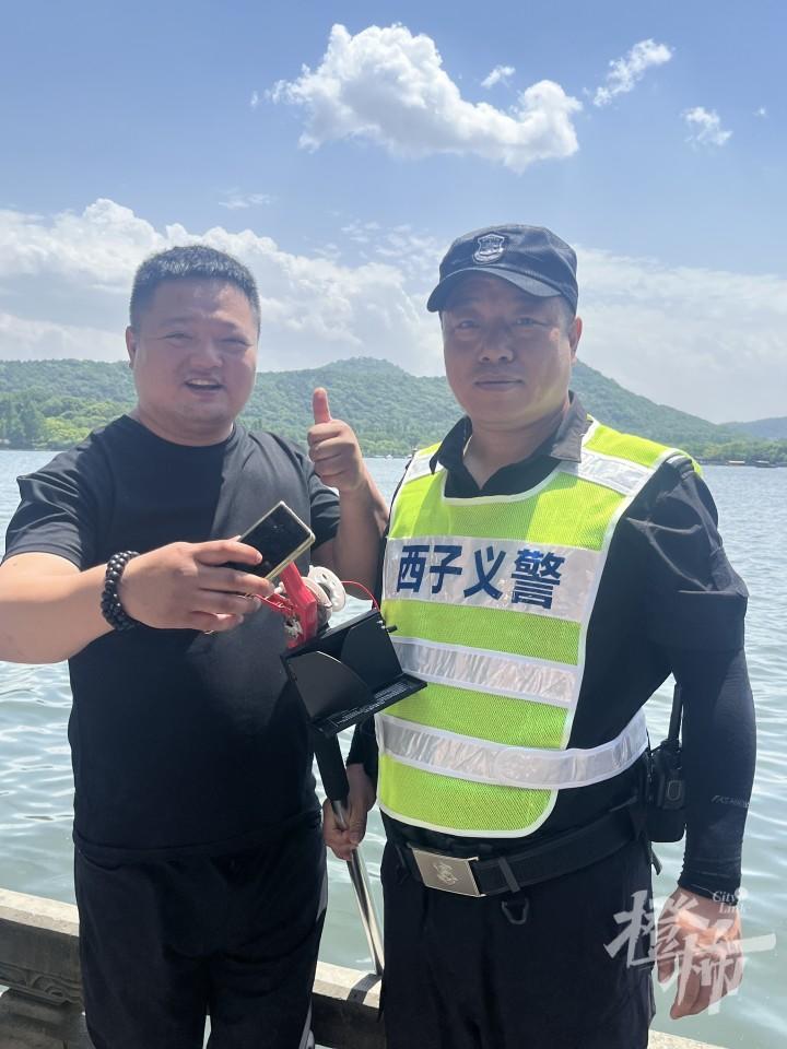 刚到码头,看到一位站得笔挺的景区公安民警,上前问了句“西湖捞哥”在哪,民警说:“我就是,我可以捞。”