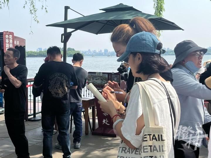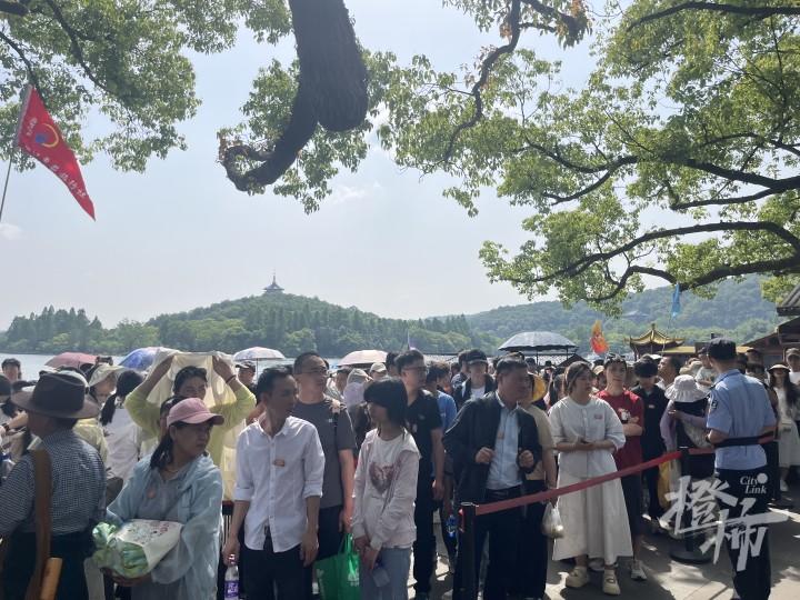 14:00,三潭印月上岛人数达两万五千人,忙碌了半天,他手机电量开始告急。