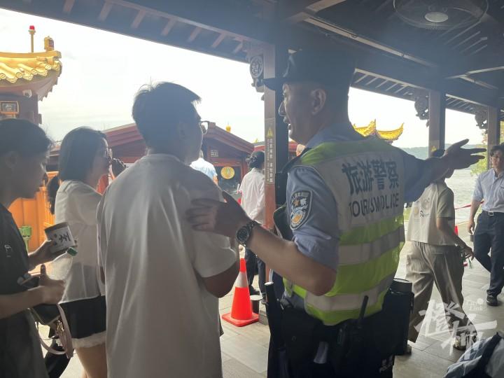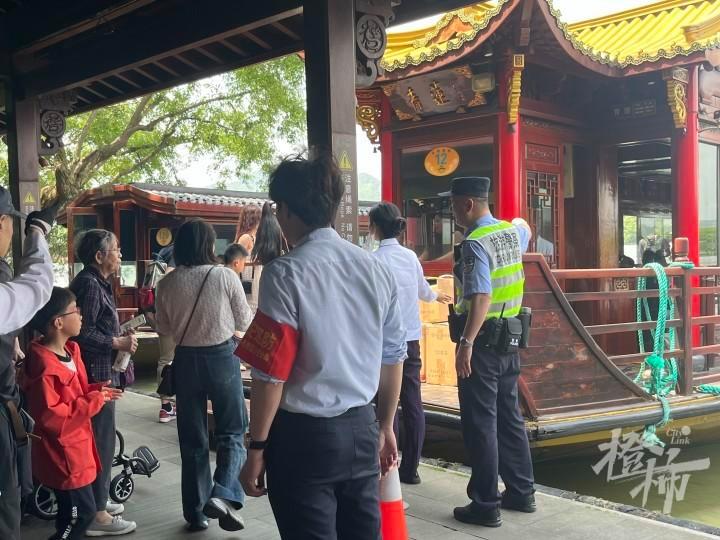 “约7点,我从所里上岛,进行安检、反恐等风险排查。之后开始正式执勤,主要关注船只安全、游客安全,协助维护秩序等。”刘西建说,水上派出所负责三潭印月的安保工作,除了民警外,还有辅警、保安26人,志愿者15人,景区管理中心也有十多人,共五六十人一起为群众服务。