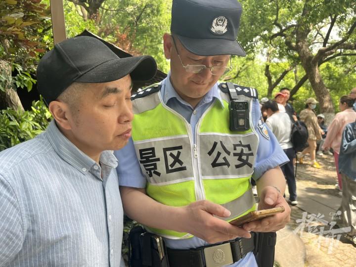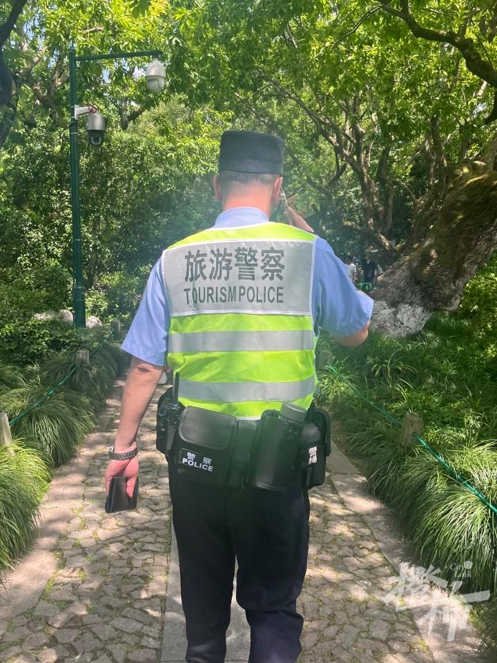 12:30,刘西建又环岛一圈,走到每个点位后,拍拍辅警的肩膀提醒他们轮流吃午饭。一路上,他不是提醒小孩不要践踏草坪,就是提醒游客当心掉到湖里,总之有操不完的心。