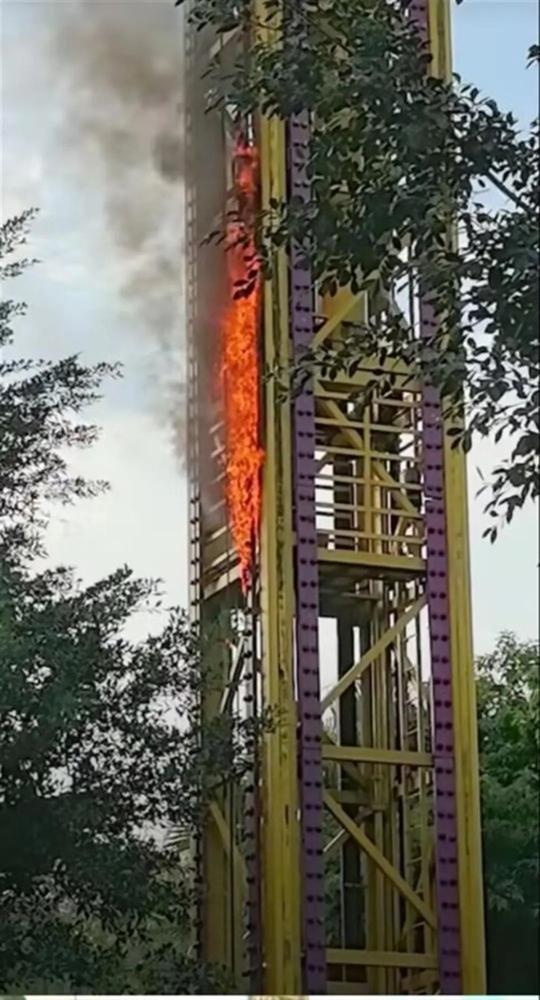 网友拍摄的视频显示,跳楼机的钢架下部起火,然后蔓延到了上方,不过跳楼机上看不到游客。现场有人在对围观者喊:“太危险了,快走快走。”视频发布者表示:“刚坐完后下来拍摄,接着就那样了,幸好游客都下来了,无人出事。”