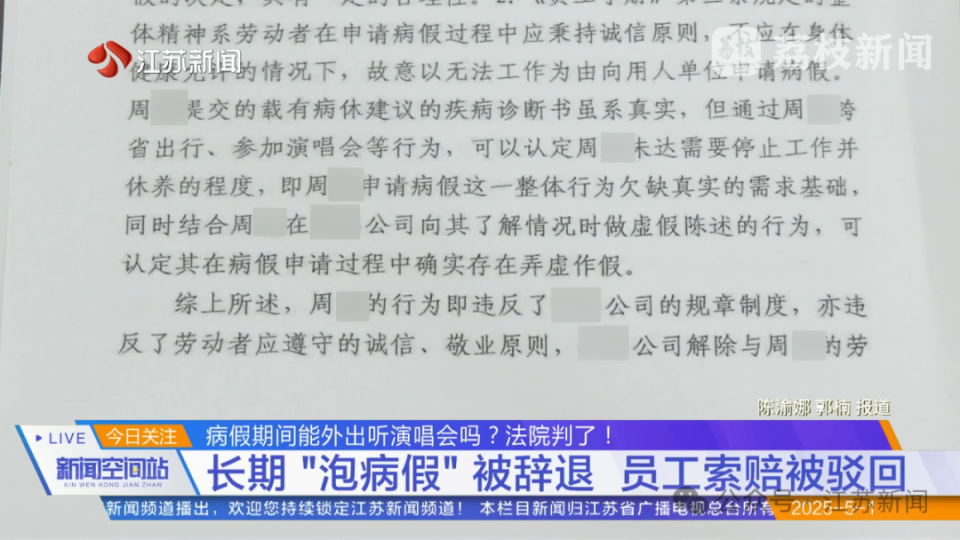 “后来调查了下周某乘坐交通工具的记录,显示周某在请病假期间,具有相当多次的乘坐高铁去外省的情况。跨省参加了演唱会以及跨省参与了亲友的婚宴,而这些情况是公司在解除劳动合同前与她多次核实,询问是否只能卧床休息时,周某坚持她就是卧床在家没有外出。”南京市中级人民法院民五庭四级高级法官刘懿介绍。