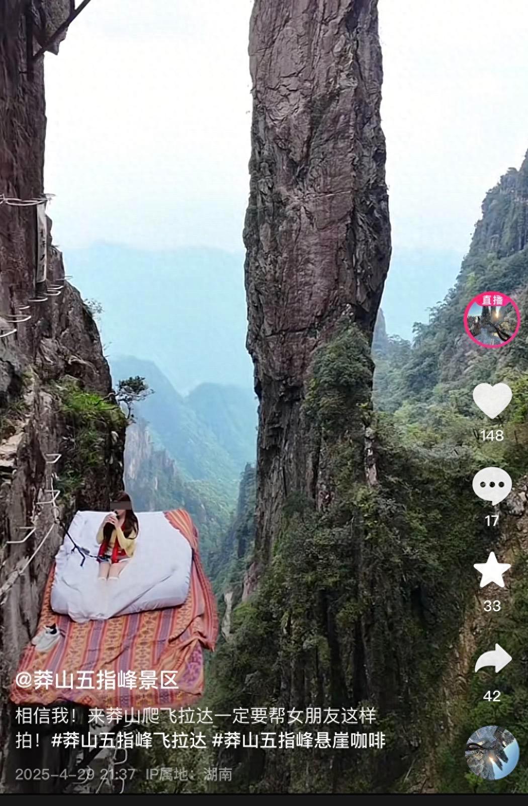今年五一期间,湖南郴州莽山五指峰景区推出的“海拔1600米悬崖睡床”引发关注。
