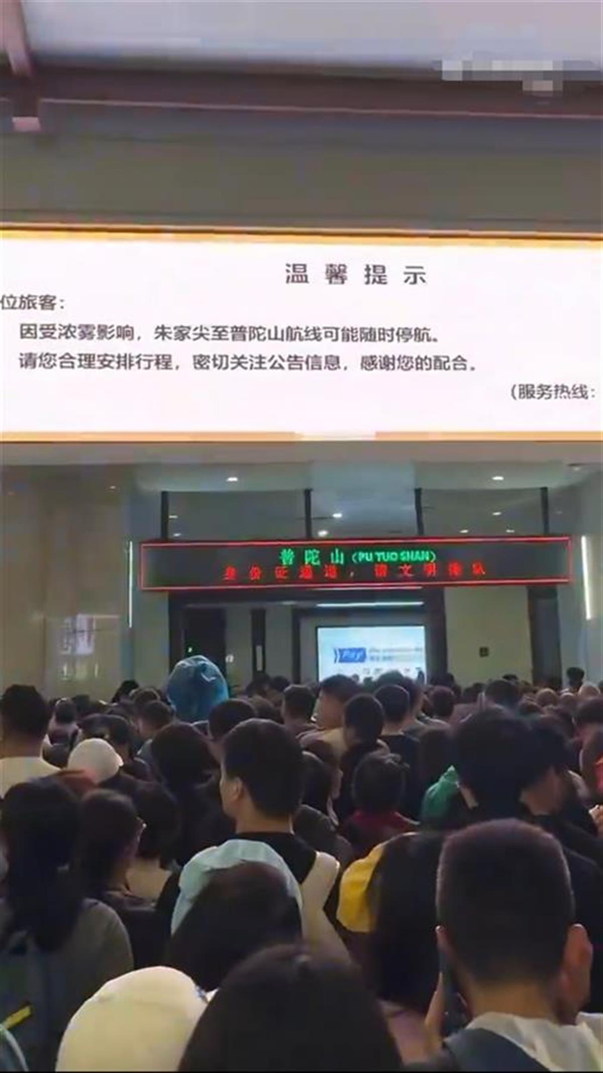 有网友发布的相关视频显示,一处客运站的电子屏提示称,因受浓雾影响,朱家尖至普陀山航线可能随时停航。