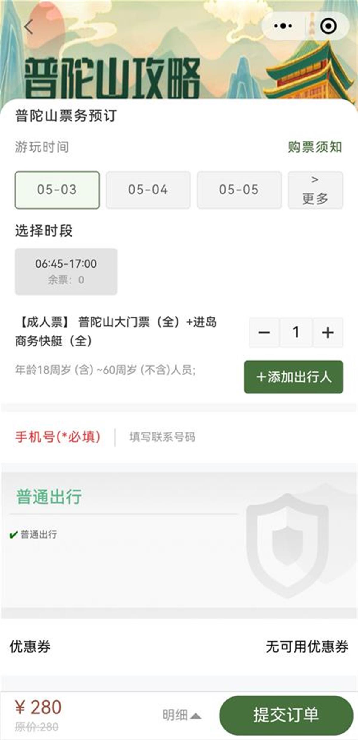 5月2日至4日前往普陀山景区的商务快艇已无法购票(截图自普陀山风景区售票平台)