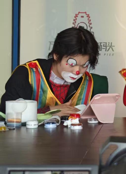 假期的第一天,他表演了7场,晚上还有踩高跷的游行。脸上虽有些许疲态,但他骄傲地告诉记者,这些小丑妆造和表演技巧,都是他自学的。随着最后一笔红色颜料点在鼻尖,一个大众眼中的小丑形象跃然眼前。