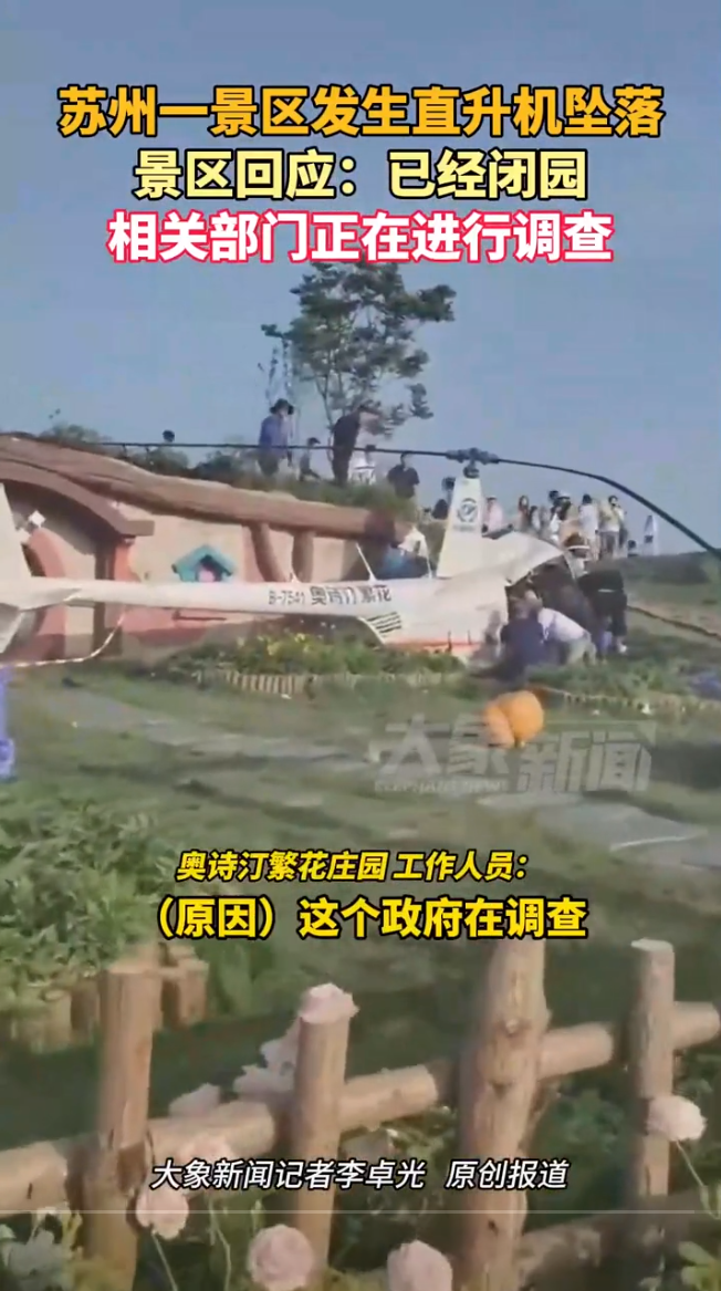 5月2日,网曝江苏苏州一景区发生直升机坠落事故。大象新闻记者致电景区询问工作人员表示,确有直升机坠落目前相关部门正在进行调查,现在已经闭园。奥诗汀繁花庄园工作人员:“(已经)因故闭园,(发生事故的是)我们的合作方,(原因)这个政府在调查。”