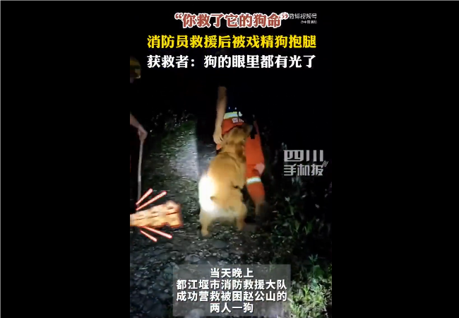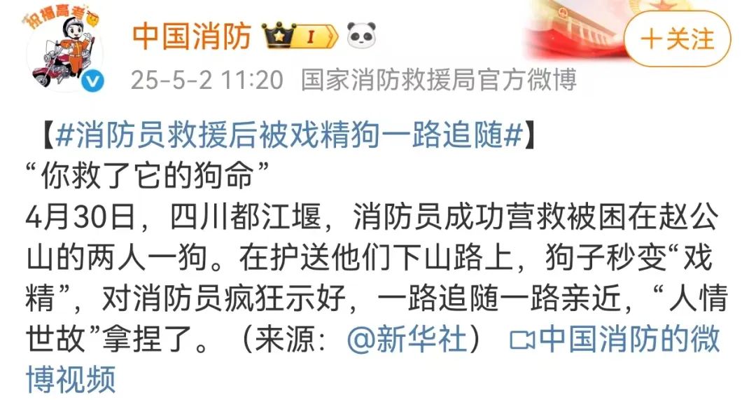 在护送他们下山路上,狗子秒变“戏精”,对消防员疯狂示好,一路追随一路亲近。