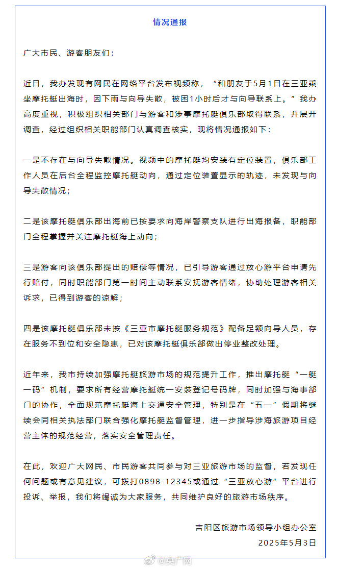 三亚再通报游客骑摩托艇出海失散事件:涉事摩托艇俱乐部停业整改