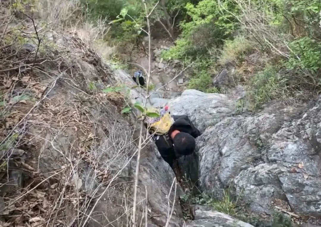 蓝天救援队员营救被困父子很快,其他队员也来到了悬崖边。经过现场研判,大家决定“逆行”,先把父亲救到悬崖之上,再把悬崖底的孩子也救上来,之后再另寻安全路径下山。半小时后,父子二人都被救至崖顶。由于长时间紧抓崖壁不能动,被救上来的父亲行走缓慢,需不时休息。