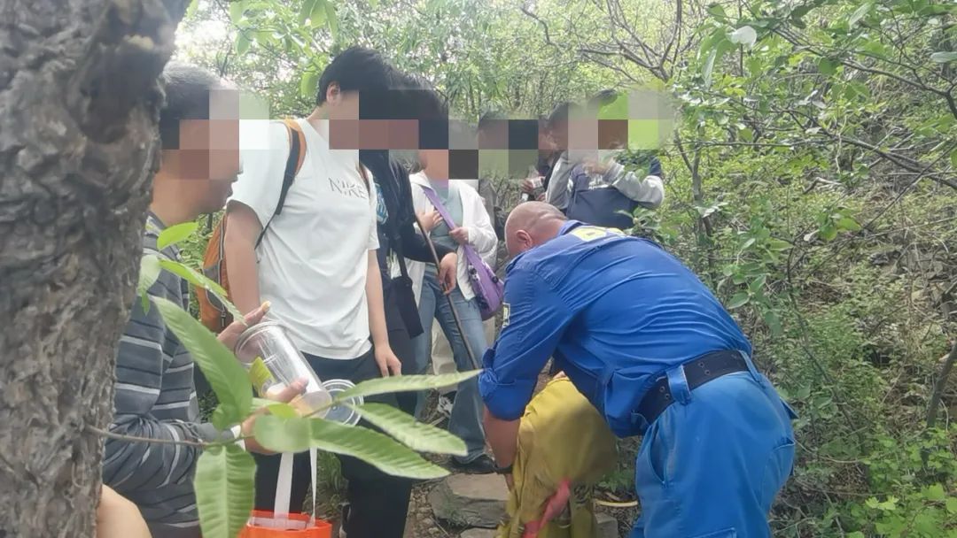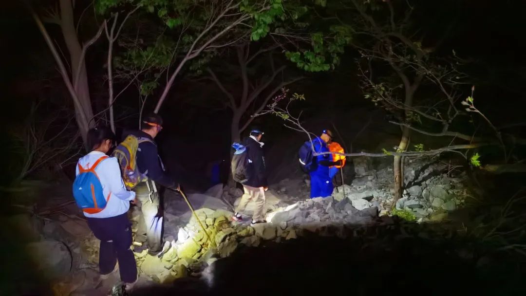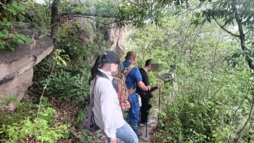 蓝天救援队员护送学生向山下转移此时,另外一组蓝天救援队员也找到了被困的9名学生,并把水和食物分给他们补充体力。当天18时许,9名学生安全到达山下,队员们又开车把他们送到附近的公交车站。
