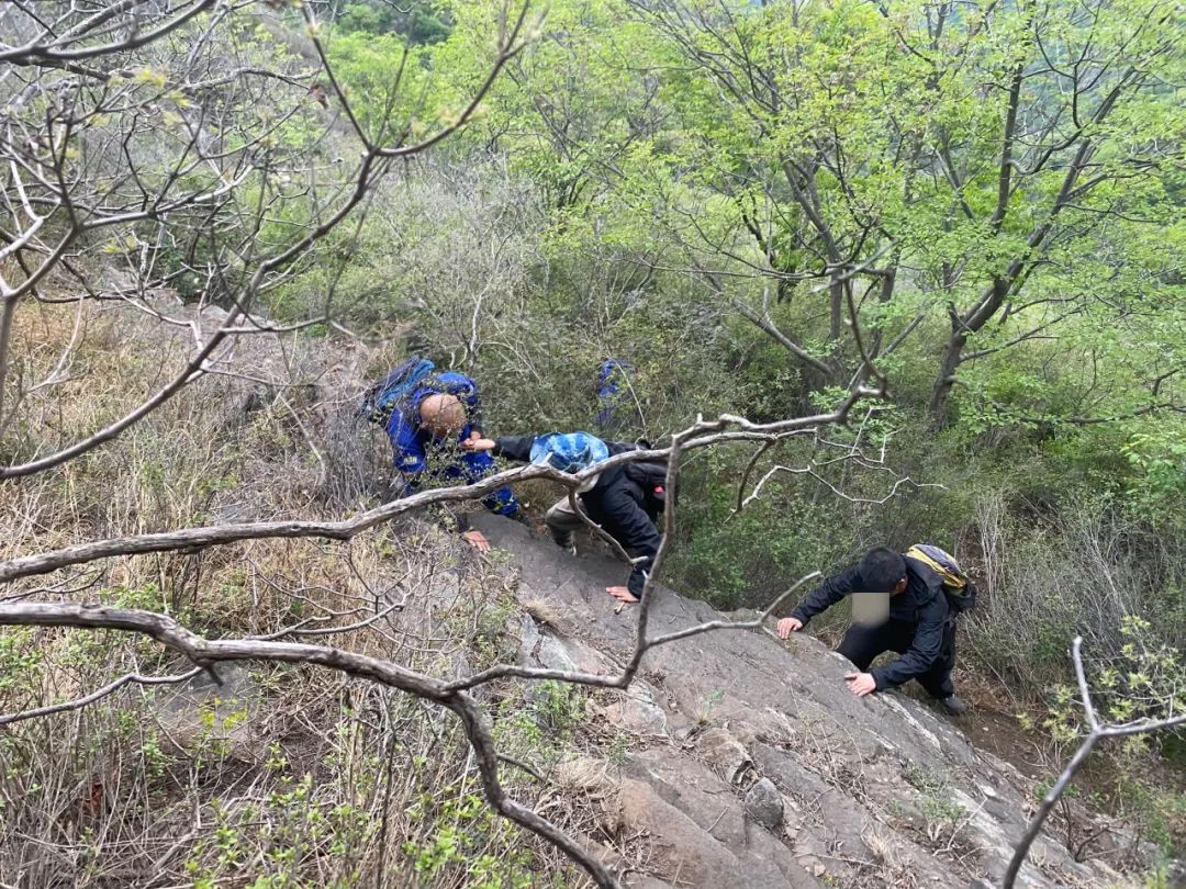 “五一”假期首日,北京房山蓝天救援队接连接到两起市民被困山中的救援任务。第一起为父亲带着15岁的儿子爬山,不想自己困在悬崖之上;第二起为包括博士、硕士研究生在内的9名高校学生在山中迷路。蓝天救援队员兵分两路,将被困的11人全部安全营救下山。