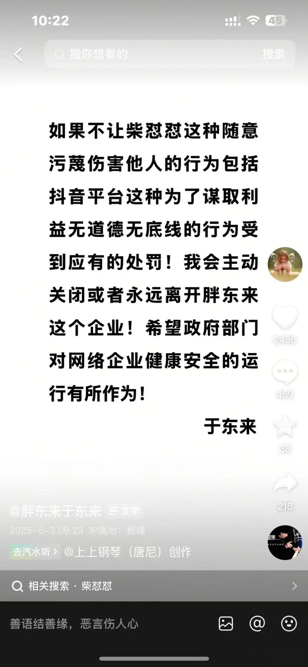 5月2日,于东来曾发文表示,“网络应该是有底线的平台,抖音上面靠个人的理解随意诽谤攻击人的行为如无人之境,法律的滞后是社会文明美好和进步的障碍。”