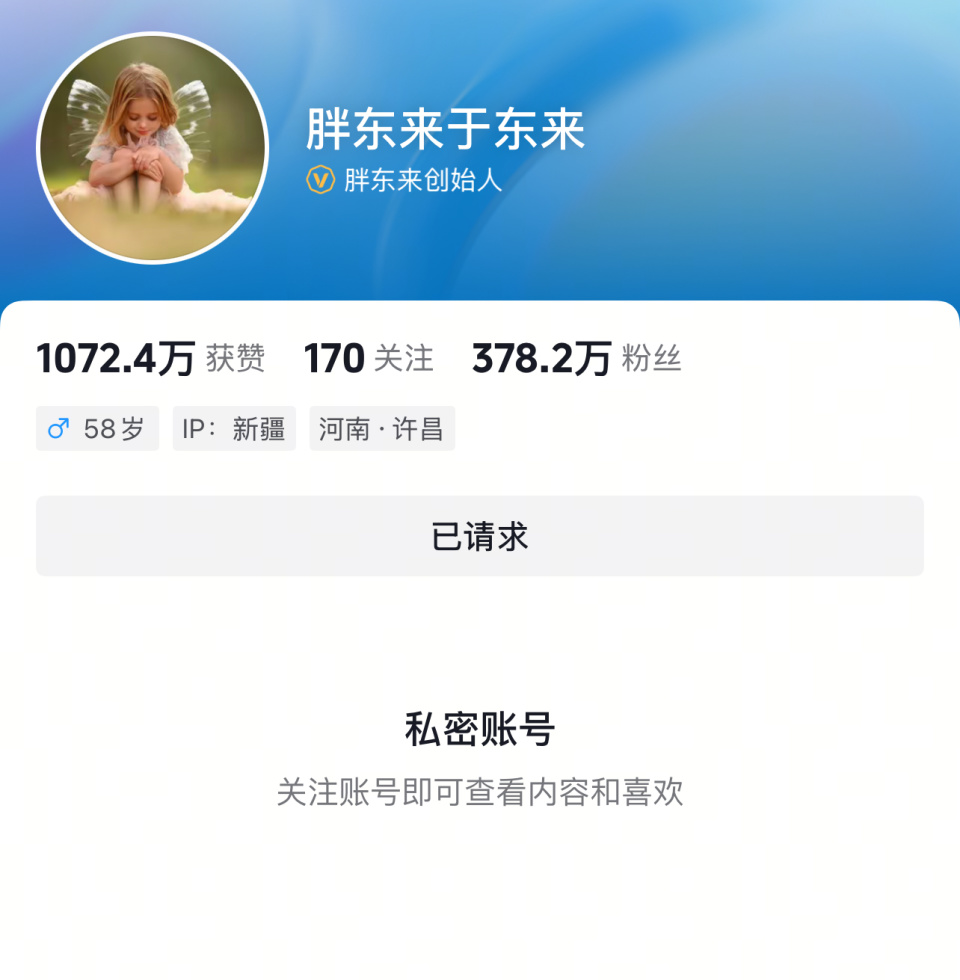5月3日下午,于东来的抖音账号已经设为私密账号,其发布内容无法查看,若要关注需发送请求。