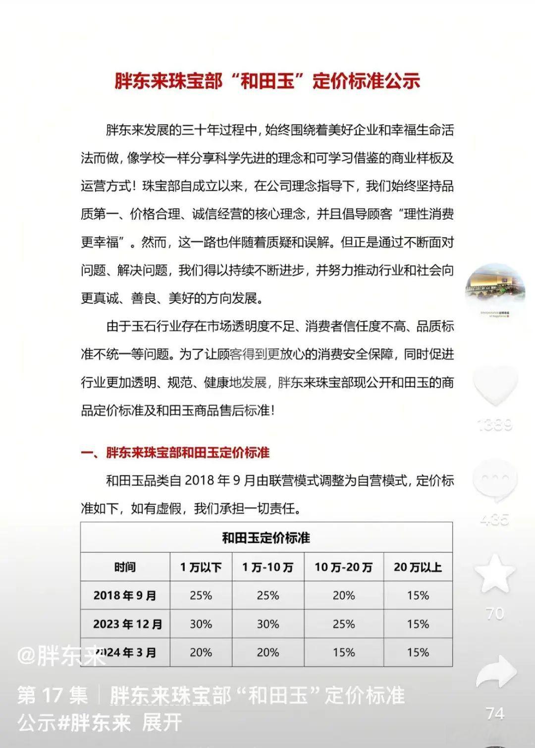 而为回应“柴怼怼”的视频言论,胖东来也多次公开玉石相关数据。其中在4月8日的回应中,胖东来公开了相关经营数据,数据显示,期内胖东来集团整体销售约62.7亿,净利约3亿,税金约2.68亿。其中,超市含税收银销售收入约26亿,而和田玉销售收入为2190万元,毛利率20%,占珠宝部销售3.6%,占胖东来商贸集团销售0.34%。
