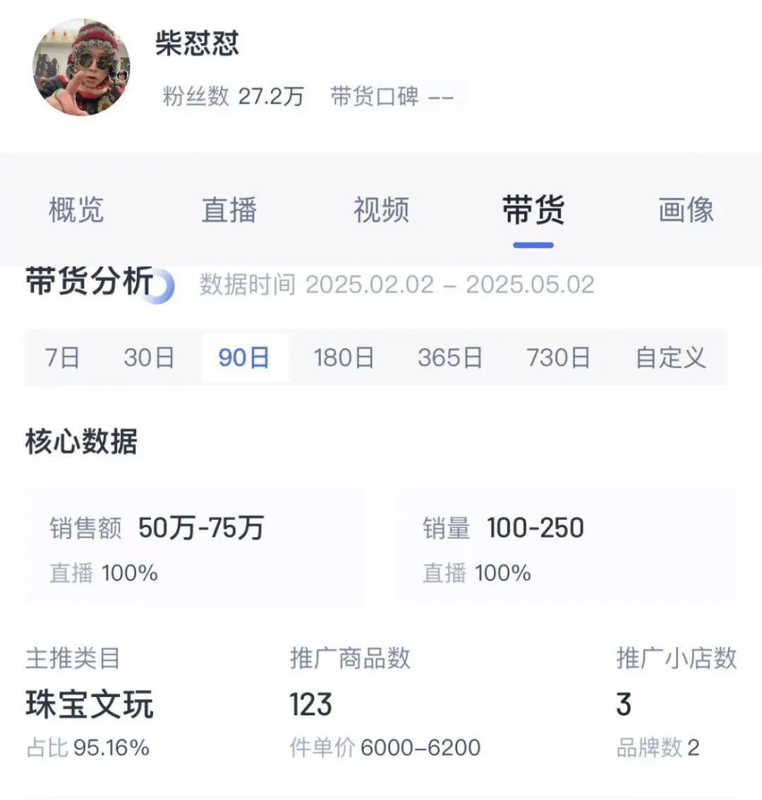 在胖东来事件之前,柴怼怼并不是一个被大众广泛认知的博主。他在短视频平台拥有20余万粉丝,属于玉石赛道的博主,蓝鲸新闻记者通过第三方数据平台查询发现,近90天内柴怼怼直播带货销售额为50万-75万之间,场均销售额在5万-7.5万元左右。带货商品中新疆和田玉手镯,单价为1.98万元。