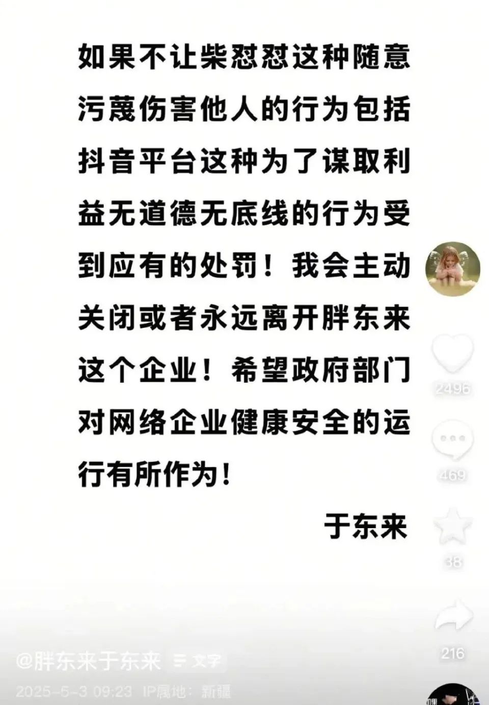 于东来发文回应称:“如果不让柴怼怼这种随意污蔑伤害他人的行为,包括平台这种为了谋取利益无道德无底线的行为受到应有的处罚!我会主动关闭或者永远离开胖东来这个企业!”