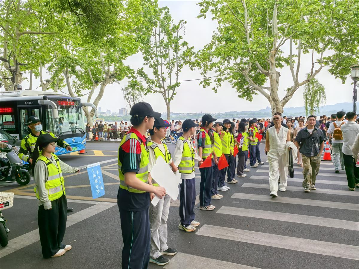 志愿队伍就这样一直重复着。据杭州媒体报道,在人流最密集的8小时里,周洲军要举旗1150次以上。2024年国庆假期西子义警第一次开始在断桥边筑人墙后,引发关注,今年共招募了400多名志愿者。
