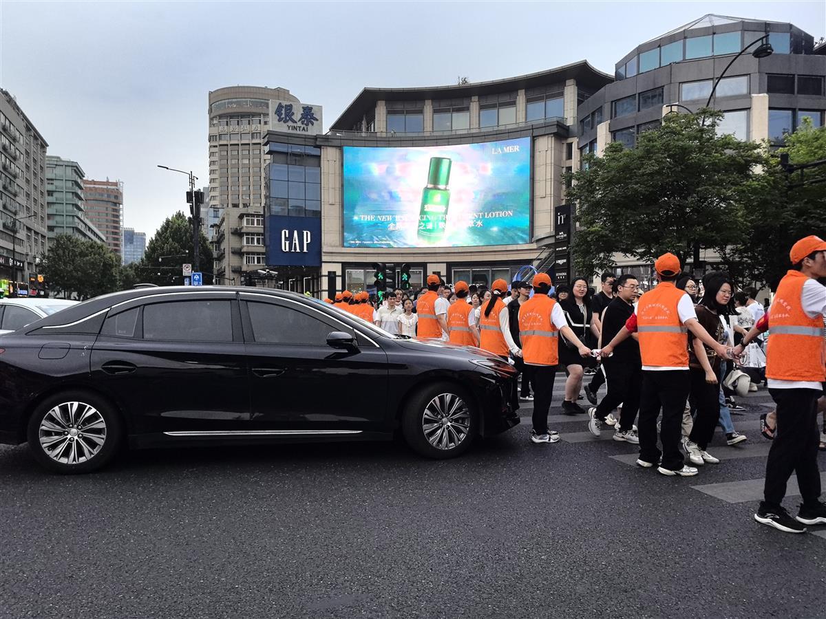在不远处的延安路与平海路、学士路交会的两个路口,则是“最美人墙”志愿者在此维持秩序。和前述西子义警类似,当人行道绿灯亮起,他们也会快步走到路中间组成人墙。因为路口通行的行人和汽车都太多,“最美人墙”的志愿者们还要在人行道红灯亮起后,催促行人赶快离开道路,并及时拦住试图闯红灯的行人。