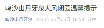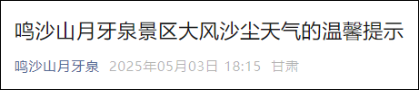 敦煌市鸣沙山月牙泉景区今晚也连发三条提示:由于大风沙尘天气,鸣沙山月牙泉景区暂停开放,原定于今晚8:30的万人星空演唱会临时取消。