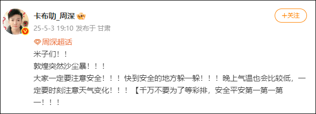今晚,周深也紧急发文提醒游客和粉丝:敦煌突然沙尘暴!!!大家一定要注意安全!!!快到安全的地方躲一躲!!!晚上气温也会比较低,一定要时刻注意天气变化!!!千万不要为了等彩排,安全平安第一第一第一!!!
