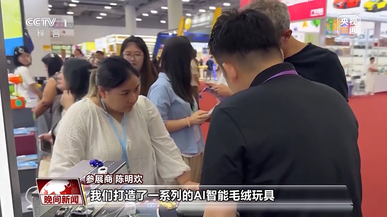 参展商陈明欢:结合潮玩的趋势,我们打造了一系列的AI智能毛绒玩具,在广交会期间得到了非常好的反响,我们一天下来连坐凳子的时间都没有。