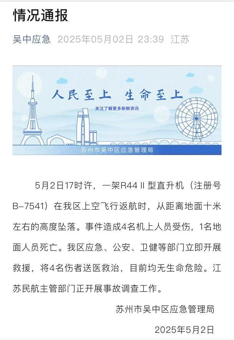 5月2日晚11时39分,苏州市吴中区应急管理局通报称,5月2日17时许,一架R44Ⅱ型直升机(注册号B-7541)在吴中区上空飞行返航时,从距离地面十米左右的高度坠落。