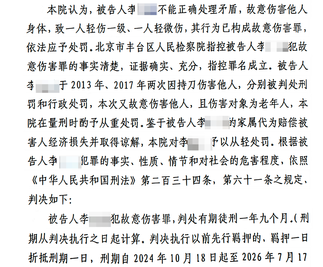 案件于4月24日在北京市丰台区人民法院开庭审理。近日,红星新闻记者从李某家属处获悉,已经收到法院判决,李某被判一年九个月。法院认为,李某当时处于疾病间歇期,有完全刑事责任能力,案发时精神状态正常,未查及幻觉、妄想等精神病症状及异常情感体验,其未处于精神障碍发作状态。