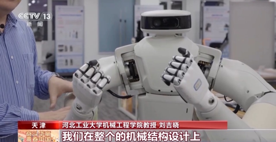 河北工业大学机械工程学院教授 刘吉晓:我们一直认为把人抱起来是我们养老护理机器人的一个标志性的动作,我们在整个的机械结构设计、构型设计、传动设计上,是有自己的特点的。例如两个双臂能够实现一共90公斤的负载,能够保证一般老人被很稳地抱起来。现在的关节叫刚柔混合的耦合关节,我们通过这样的构型设计,每个关节其实能够像人一样实现两个自由度的弯曲、翻转,能够在提高负载的前提下,提高整个机械臂的灵活性。